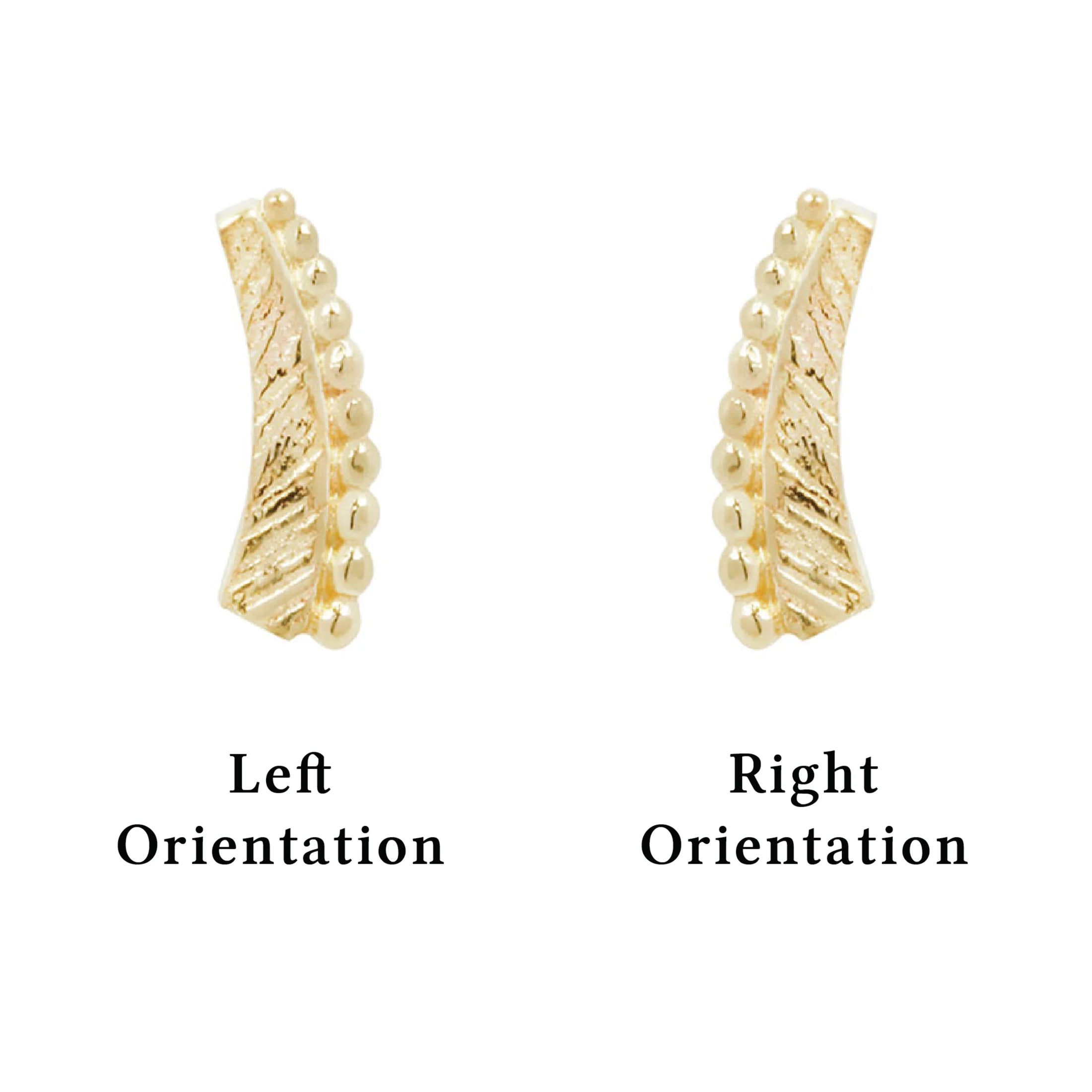 Inspired by the light feathers of birds, Soar is a textured 14kt gold threadless end with a beaded edge. Soar encompasses honor and freedom into a stunning everyday piece. Add to your rook, helix, and lobe in the left or right orientation.
