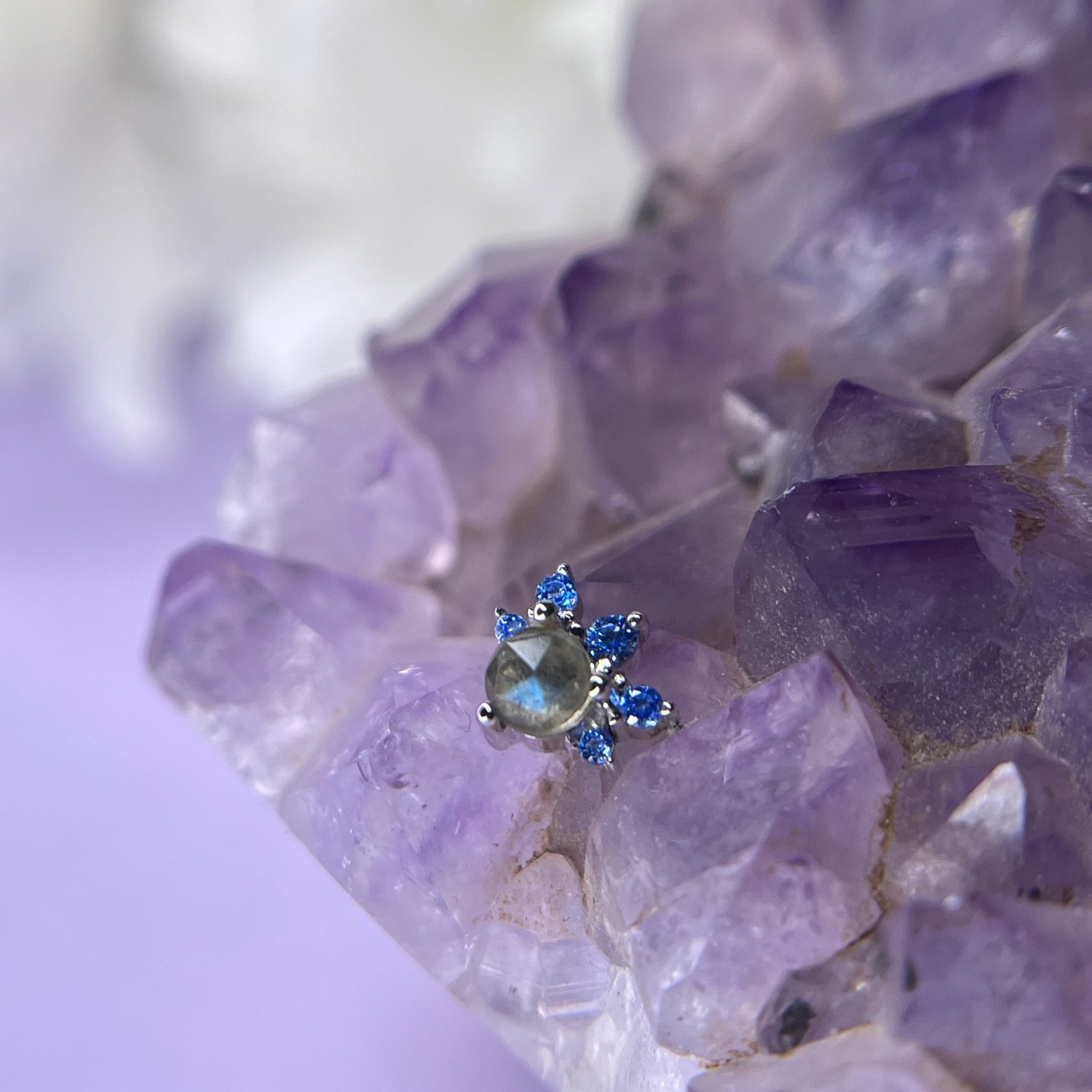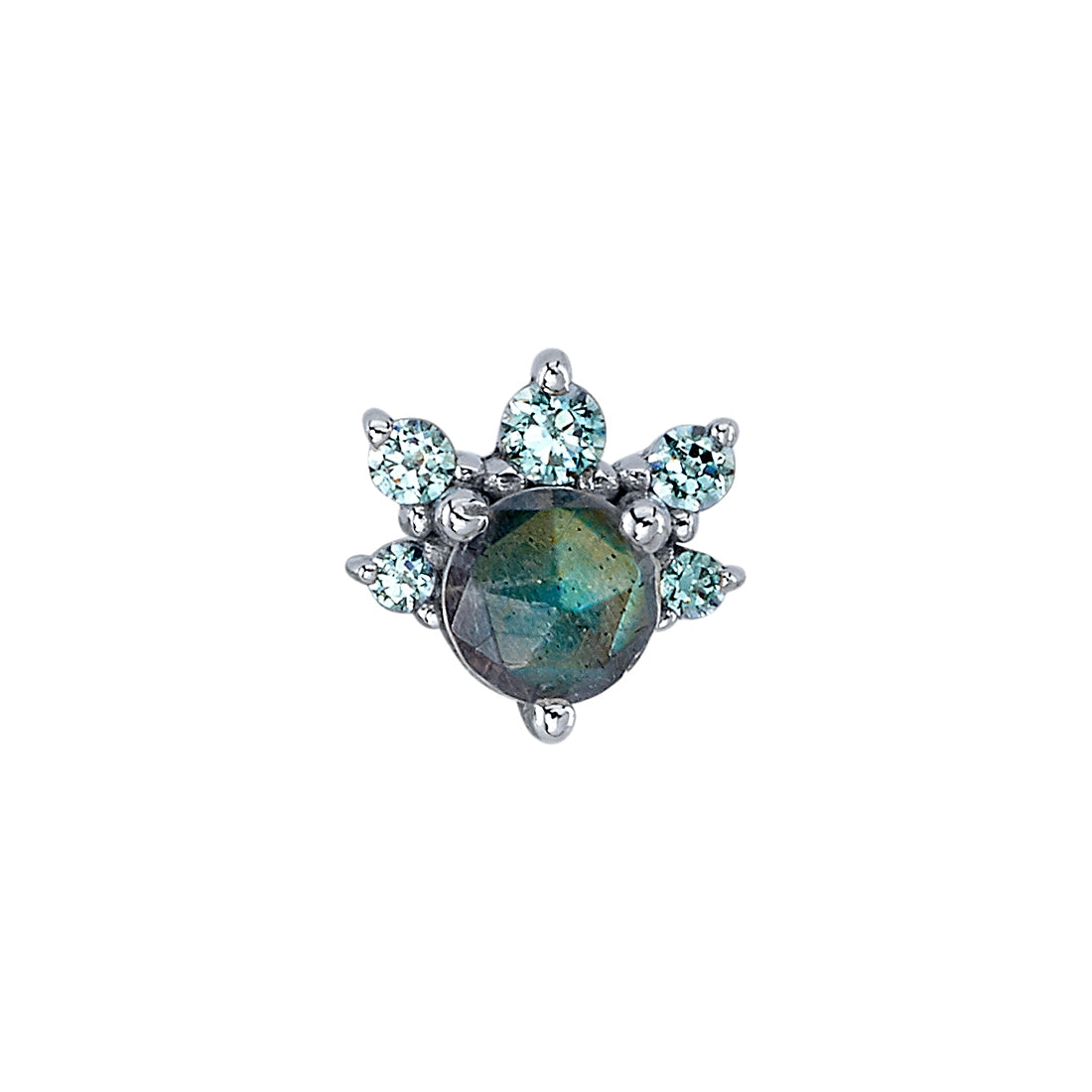 Option 1: 14k white gold, 16g/18g internally threaded, rose cut labradorite center with arctic blue accent stones