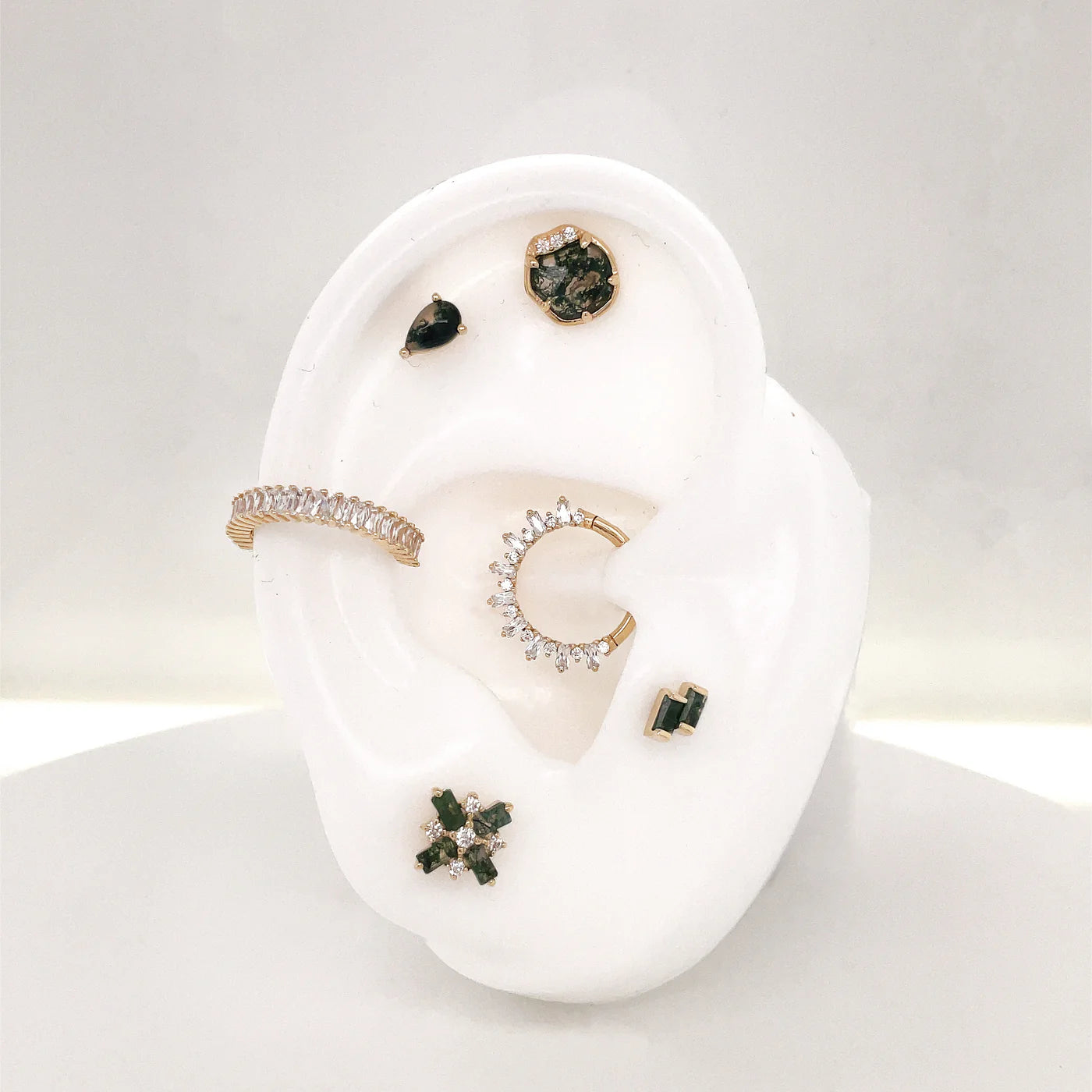 This jewelry piece is sure to be the star of the show! Our Cult Favorite clicker features baguette cut Swarovski CZs in 14kt golden chic symmetry. Wear this on the lobe, helix, or daith for the perfect spot to showcase this masterpiece. Perfect for a elegant night out on the town!