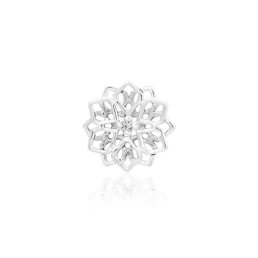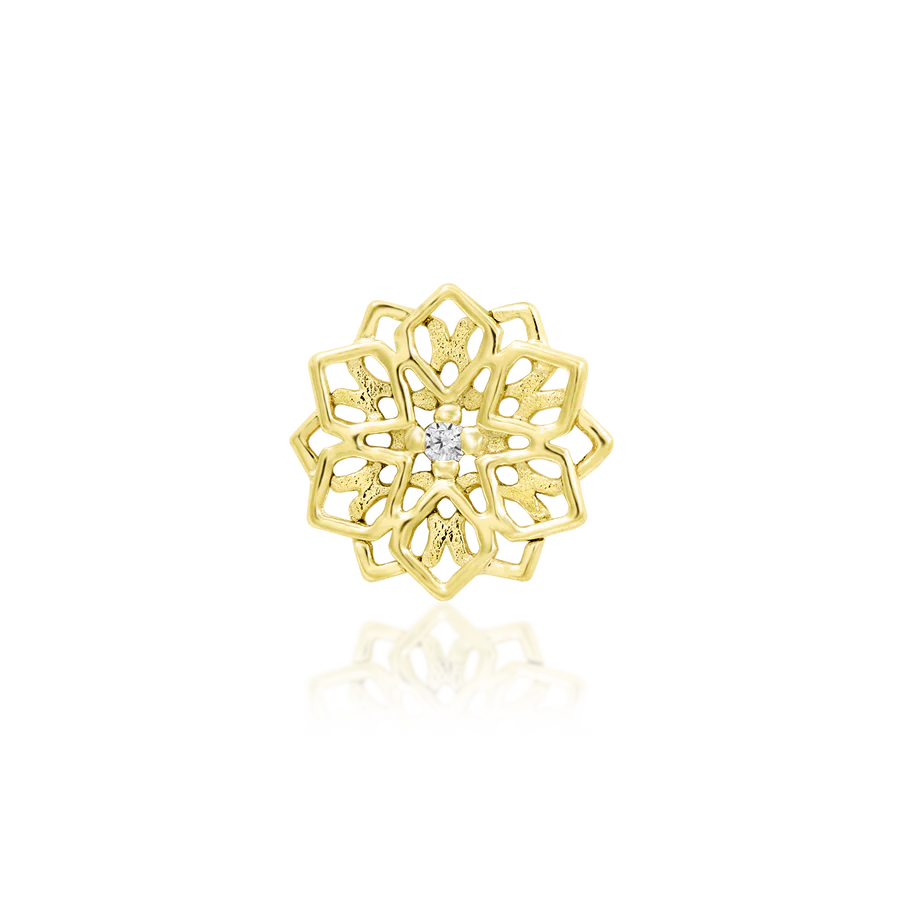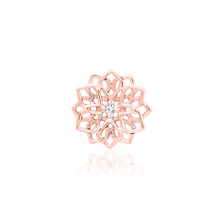 Introducing, Chloe!  A stunning, geometric style solid gold mandala design with a 1mm CZ in the middle.  It measures 5.8mm x 5.6mm and is in solid yellow, rose or white gold.