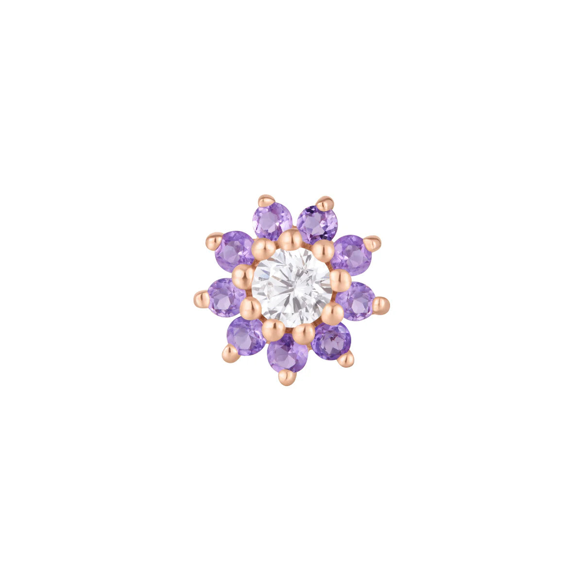 Flower Power with a pop of color! The Eloise Flower packs a lot of shine + style in a small package! Low-profile set Amethyst makes this design perfect for your earlobe, helix/flax, tragus, philtrum, and nose piercings.