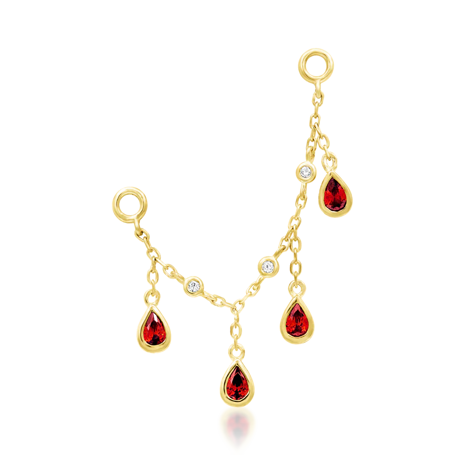 This stunning 38mm x 10.2mm chain features a set of hanging four 2x3mm dark garnet pears and a triple touch of 1mm white czs