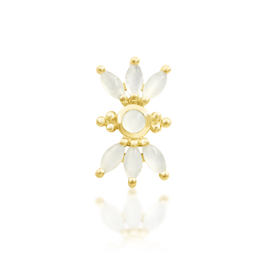 This intricate design features a radiant sunburst-inspired motif, with marquise-shaped accents and delicate bead detailing, creating a dazzling and elegant look.