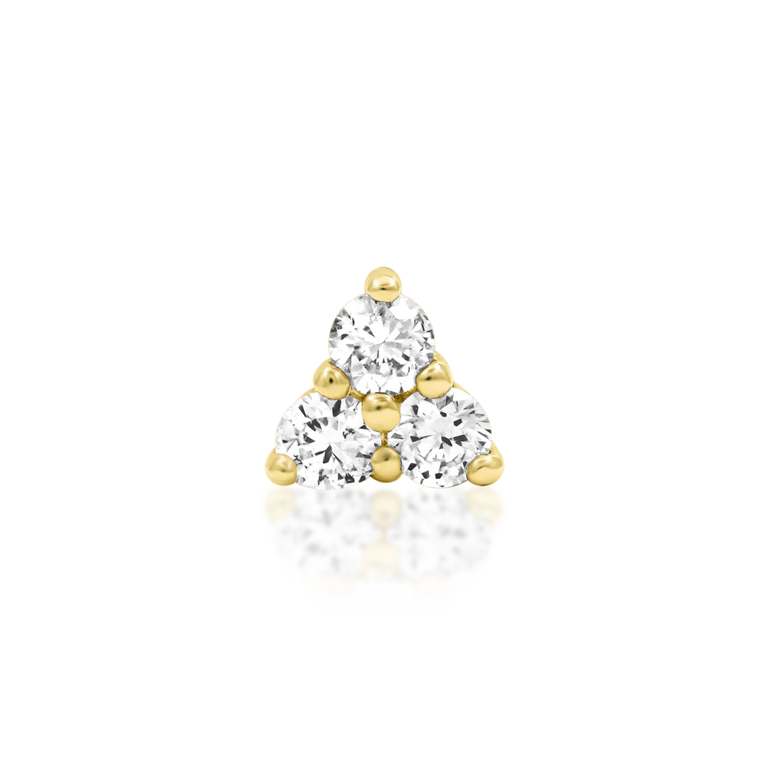 Our Threadless Diamond Trinitys are available in solid 14k yellow gold. The diamonds measure 1mm each (0.005 ct)