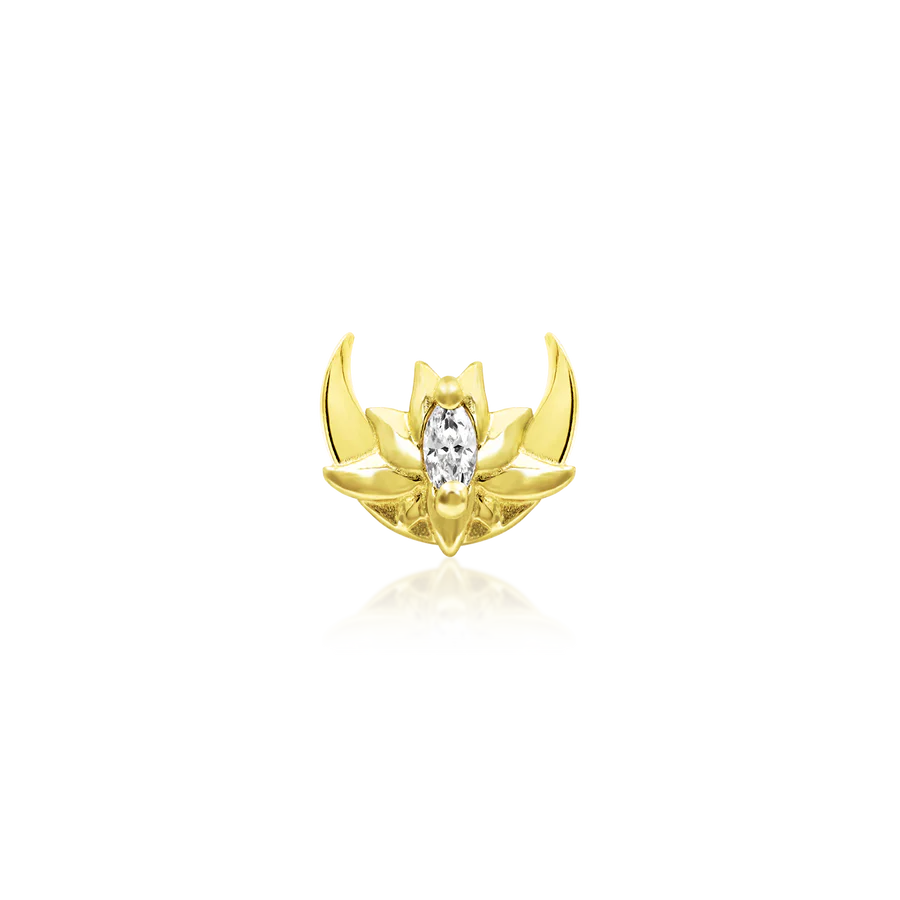 You know your clients best, so give them the best with the third and final piece in our Guardian Series, our Guardian Moon threadless end. Guardian Moon has an elegant marquise cut cubic zirconia set amongst a fully blossomed flower, held by our beautiful moon silhouette.   Use this piece as part of a complex or unique curation, or make it a star of the show!  It measures 6.70 mm x 5.60mm.
