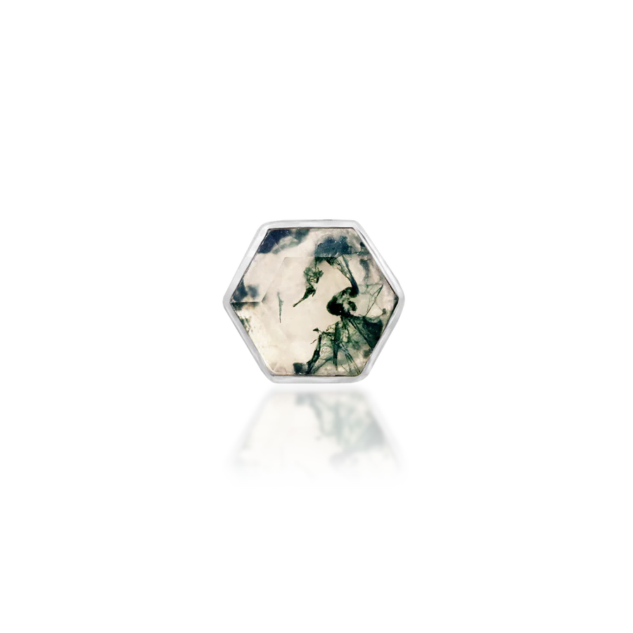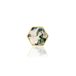 A breathtaking 4.5x4mm hexagon cut genuine moss agate stone wrapped in a 14kt gold frame.