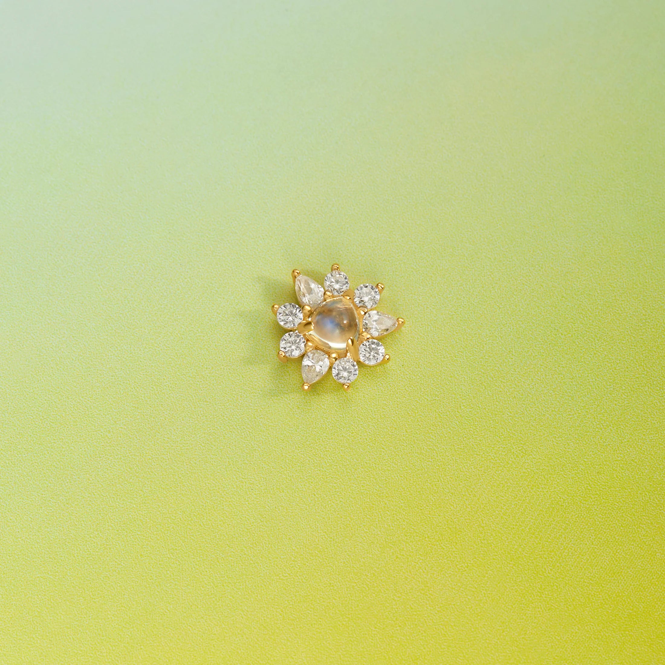 Bayside will have you sparkling like the stars! This threadless end features a breathtaking trillion shaped rainbow moonstone as its core, encircled by a radiant halo of sparkling White CZ's.