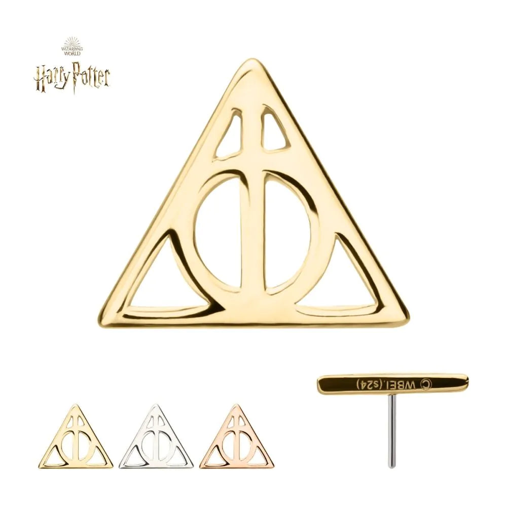 14Kt Gold Harry Potter Deathly Hallows Threadless Top. Made of solid 14kt nickel-free Gold with durable 316LVM ASTM F-138 Implant Grade Steel Pin designed to be practical and easy to use. Fits all sizes of pins and bases in our threadless body jewelry line. Pin Size: 0.45mm x 4.7mm.