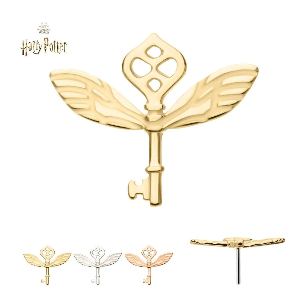 14Kt Gold Harry Potter Winged Key Threadless Top. Made of solid 14kt nickel-free Gold with durable 316LVM ASTM F-138 Implant Grade Steel Pin designed to be practical and easy to use. Fits all sizes of pins and bases in our threadless body jewelry line. Pin Size: 0.45mm x 4.7mm